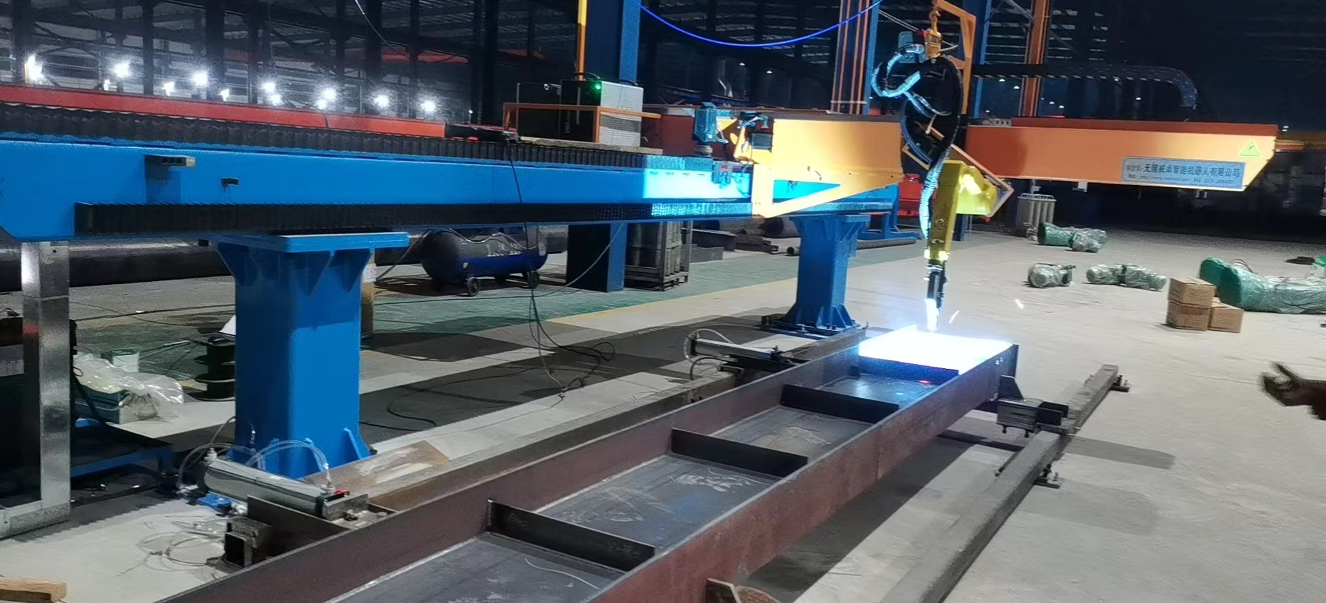 智能焊接在鋼構(gòu)行業(yè)的成功應(yīng)用針對(duì)鋼結(jié)構(gòu)中常見的H型鋼等鋼梁工件,威卓設(shè)計(jì)研發(fā)了小龍門智能焊接工作站,焊槍部分使用鋼梁專用焊槍,更適用于鋼梁焊接;搭配傳感器使用,自動(dòng)尋位識(shí)別焊縫,無